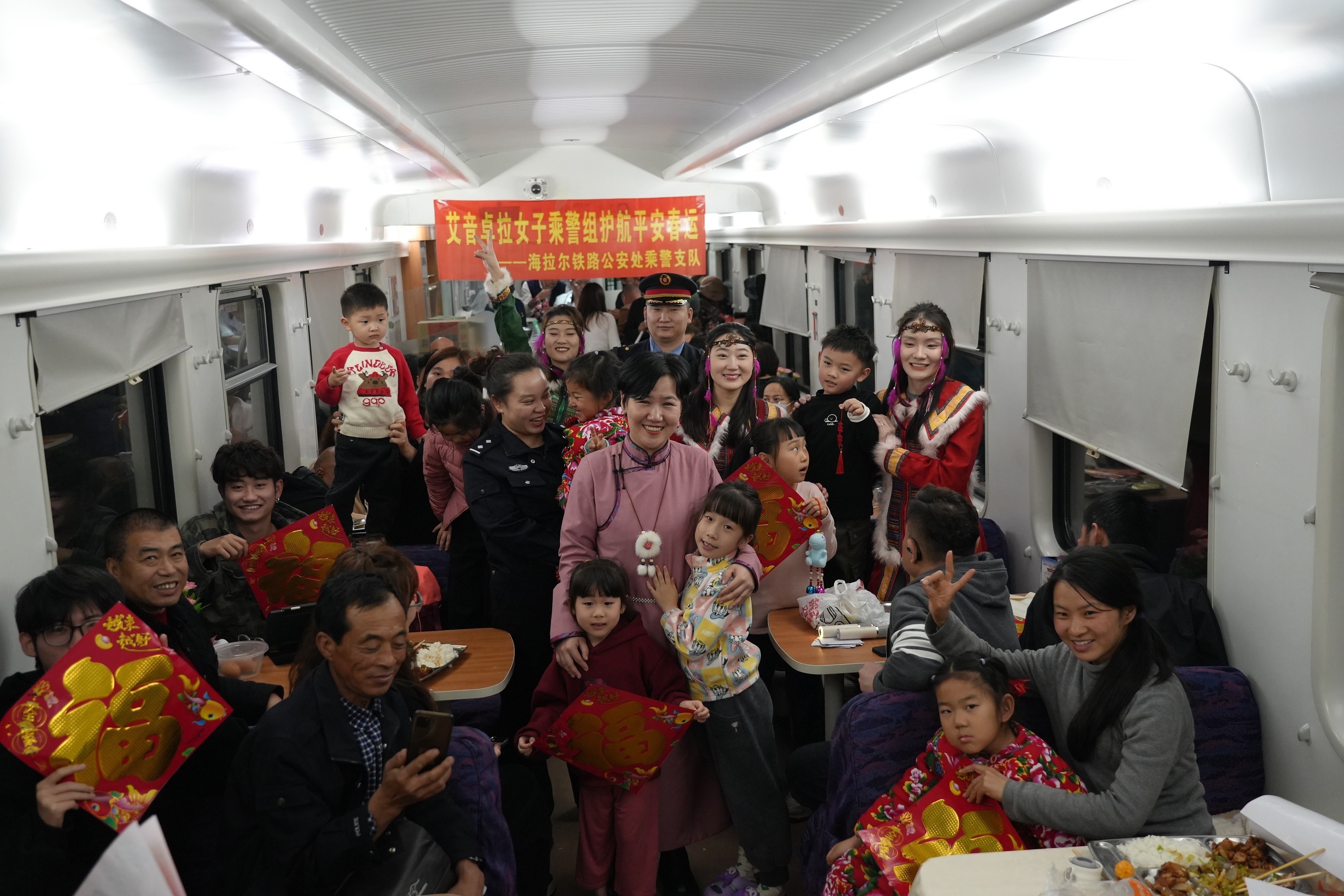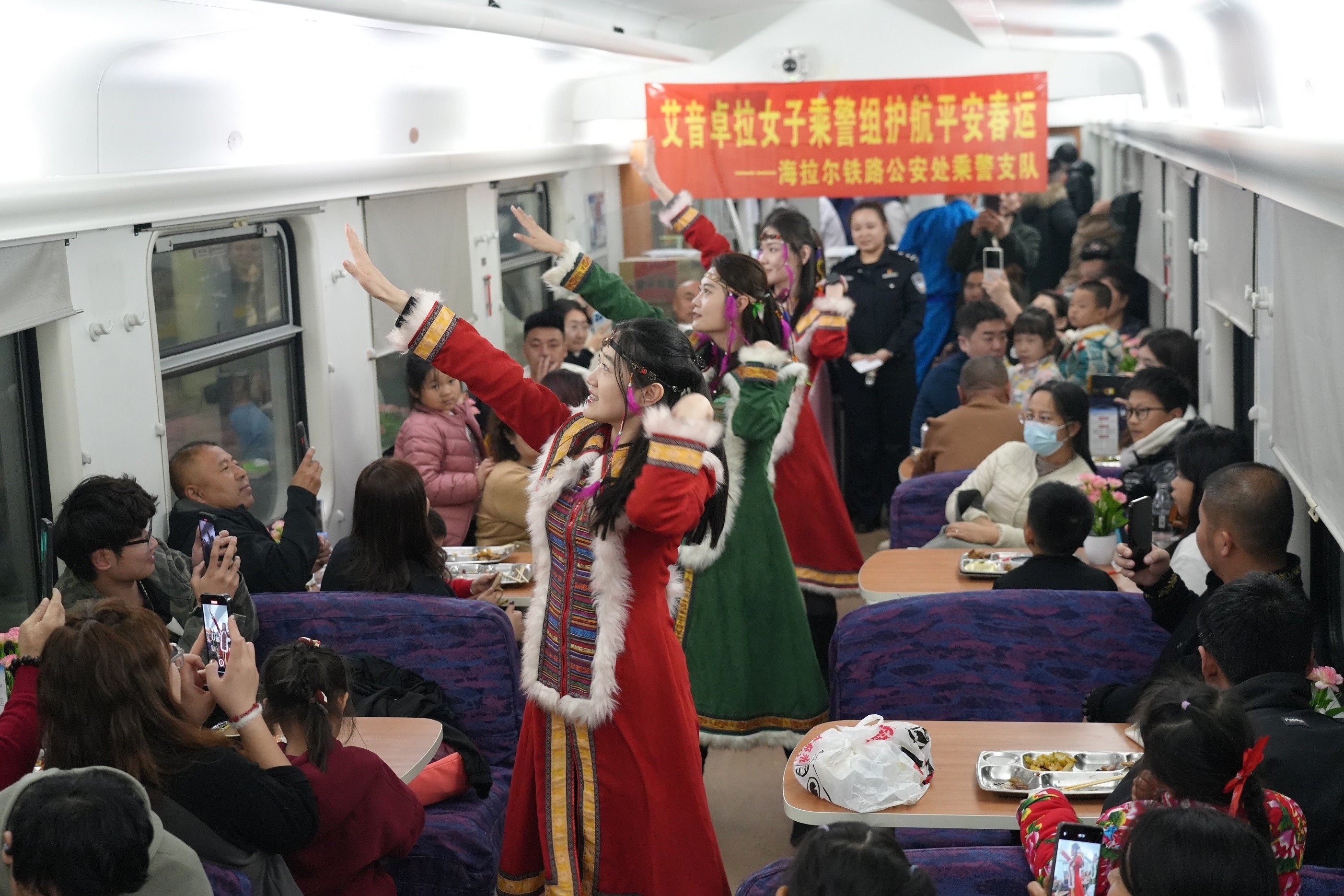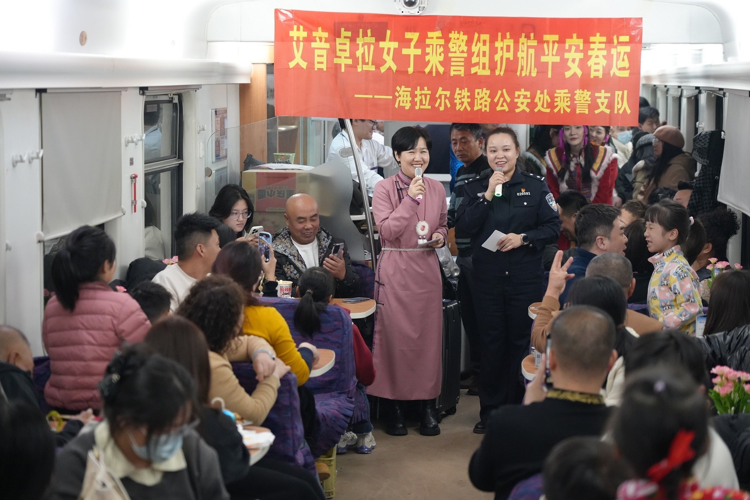 女子乘警组在K4292次列车上开展文艺演出,温暖旅客回家路。(新华社发)艾音卓拉是蒙古语,意为旅途中的守护灯。在2025年春运首日,海拉尔铁路公安处乘警支队成立了艾音卓拉女子乘警组,在春运期间登乘重点列车,护航旅客平安出行。“为缓解大家在长途旅行中的疲劳和焦虑,我们的蒙古族警花们精心准备了一场特别的文艺演出。希望在旅途中为大家增添一份欢乐和温馨。”作为主持人的民警刘卉羽泊为这场晚会开了场。